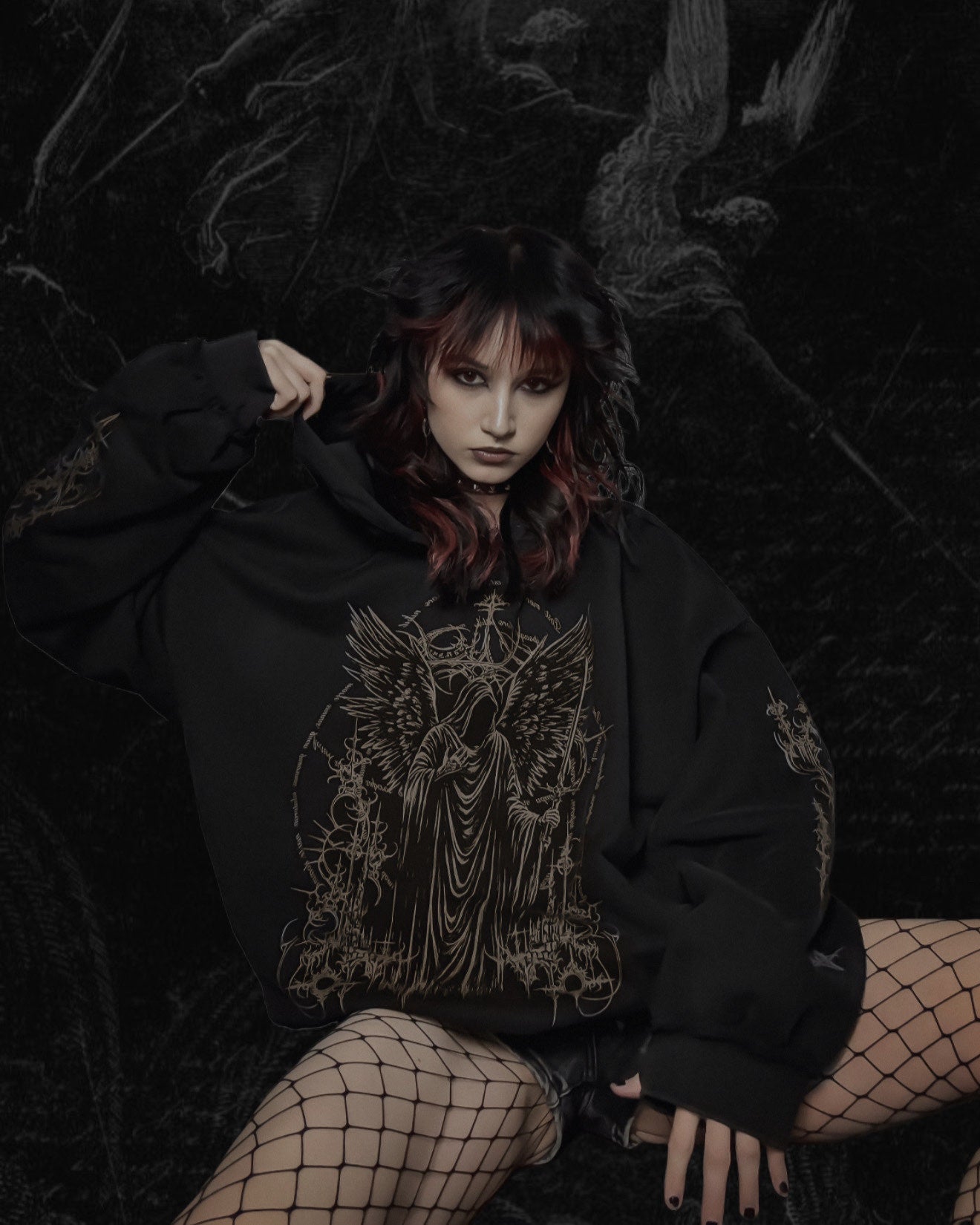 Introducing Protection Spell. Built from heavy, fleece-lined cotton, it carries hand-drawn, sigil-inspired line work across the front, back and sleeves. The extended arms fold into thumb-hole grips, separated by a deliberate fray that nods to its underground craft. Side pockets keep essentials close, and the hood adds an extra layer of coverage when you need it.